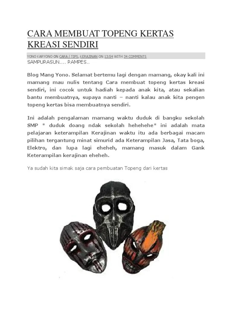 Seperti kreasi dari perupa pak yus (yuswantoro adi) yang membuat topeng dari bahan kertas koran. Tutorial cara mudah membuat topeng kertas buat pesta ulang tahun, atau apapun acara mu, mudah, cantik #caramembuat. Find this pin and more on projects to . Cara membuat topeng dari kertas karton. Cara termudah untuk membuat topeng karnaval adalah dengan menggambar .